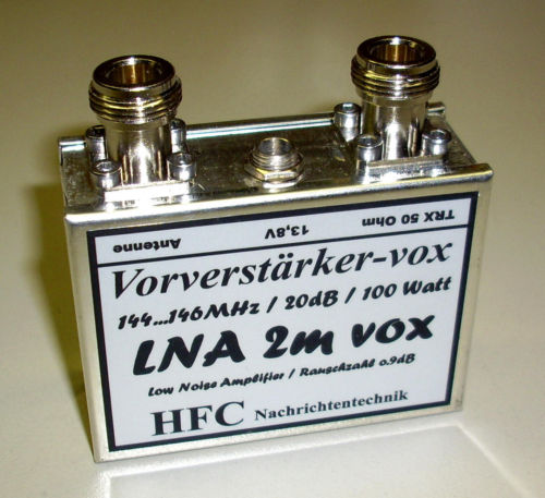 Der rauscharme Vorverstärker LNA - 2m - VOX (Low Noise Amplifier) - Frequenzbereich 144 ... 146 MHz - der Fa. HFC Nachrichtentechnik besticht neben einer qualitativ hochwertigen Verarbeitung mit exzellenten technischen Daten. Er dient zur Verbesserung der Empfangseigenschaften von Amateurfunkstationen im 2-m-Band. Der Vorverstärker ist mit einem Bandpassfilter ausgestattet, der Außerbandsignale wirkungsvoll unterdrückt. In der Eingangsstufe ist ein GaAs-FET gekoppelt, der eine sehr niedrige Rauschzahl und eine hohe Durchgangsverstärkung besitzt. Der Vorverstärker bietet die Möglichkeit der direkten Speisung über eine Cinch-Buchse oder der Fernspeisung (mittels Fernspeiseweiche, siehe andere Auktion) über das vorhandene Koaxialkabel. Der LNA-2m-VOX verfügt über eine automatische Sende-/Empfangsumschaltung. Maximal übertragbare Leistung: 100 Watt !!! Der Vorverstärker LNA-2m-VOX ist in einem stabilen Weißblech-Gehäuse (74 x 56 x 30 mm) untergebracht. | ||||||||||||||||||||||||||||||||||||||||||||||||||||||||||||||||||||||||||||||||||||||||||||||||||||