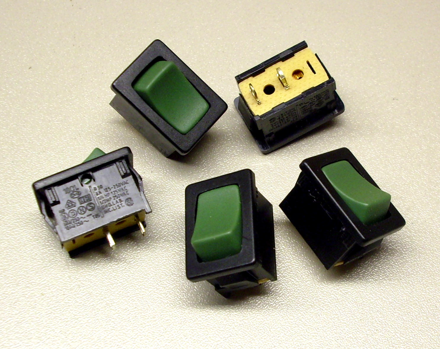 5 Stück Leistungskippschalter (Wippschalter) Einfache Snap-In-Montage, hochwertige Neuware aus Lagerauflösung Technische Daten: Ausführung ............................................ Ein/Aus Schaltleistung .......................... 125-250 V/AC/6A Anschluss ................. Flachstecker 4,8 x 0,8 mm Frontplatten-Ausschnitt ............. 13.0 x 19.2 mm Wippe .......................................................... grün | ||||||||||||||||||||||||||||||||||||||||||||||||||||||||||||||||||||||||||||