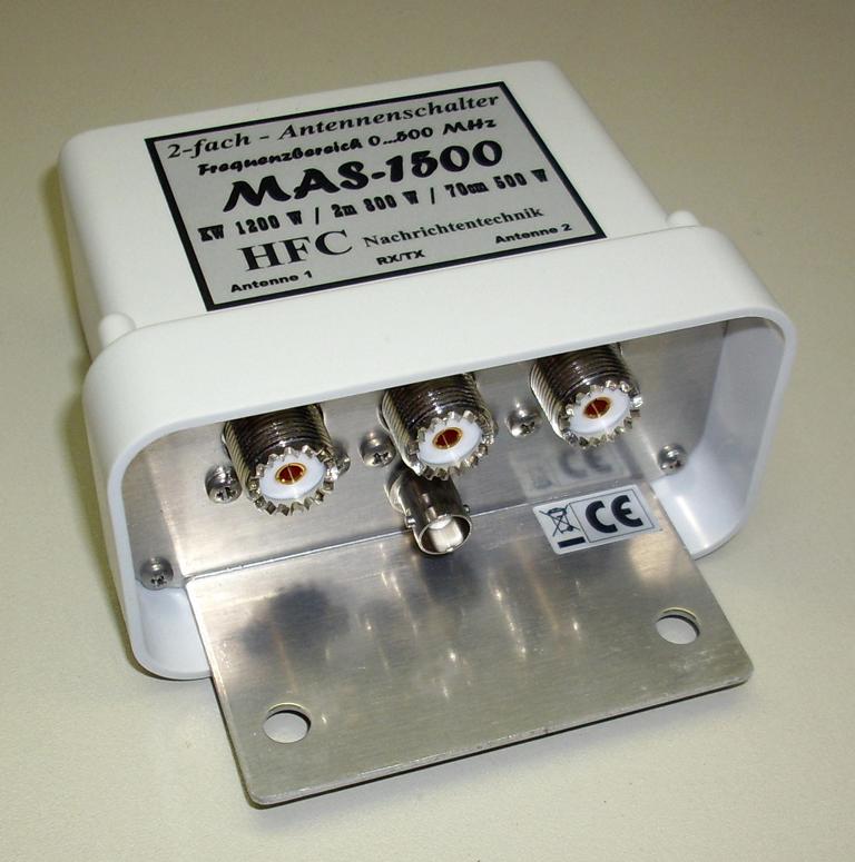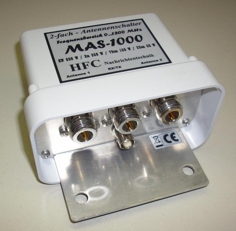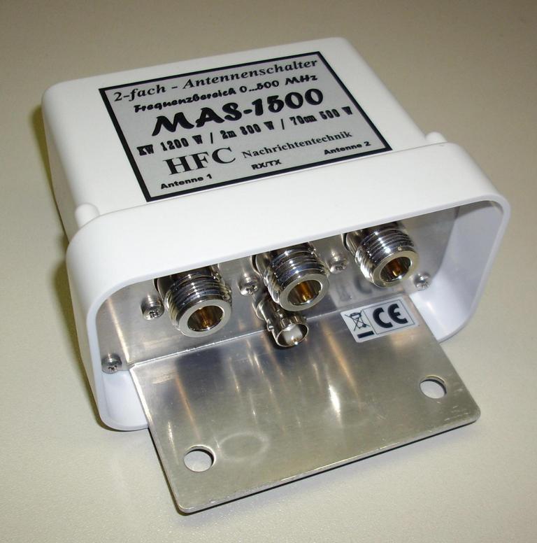 Der MAS-2000(Frequenzbereich 0 ... 500 MHz) der Fa. HFC Nachrichtentechnik ist ein verlustarmer Antennenumschalter für 2 Transceiver und jeweils 2 Antennen im wetterfesten Mastgehäuse für direkte Montage am Antennenmast. So kann beispielsweise bei Verwendung von 2 Koaxkabeln die Umschaltung von einer 2m-Antenne auf eine 70cm-Antenne sowie einer KW-Antenne und einer 6m-Antenne mit dem MAS-2000 vorgenommen werden. Die in SMD-Technik aufgebaute Schaltung sowie leistungsstarke HF-Relais gewährleisten einen breiten Einsatzbereich von der Kurzwelle bis zum 70-cm Band. Aufgrund der niedrigen Dämpfung sind Durchgangsverluste kaum messbar. Die Speisespannung darf zwischen 12 - 15 Volt betragen. Die Leistungsaufnahme beträgt ca. 2 x 30 mA. Die nötige Spannungsversorgung wird extern über zwei Kabel mittels vierpoliger Buchse vorgenommen. Das Gerät verfügt über eine Verpolungsschutzschaltung. Die Umschaltung zwischen den angeschlossenen Antennen erfolgt über die zugeführte Spannung, d.h. das Ein- bzw. Ausschalten der Spannung bewirkt eine Relaisumschaltung. Bei Nichtanliegen von Spannung ist die Antenne 1 durchgeschaltet. Das Mastgehäuse (135 x 75 x 115 mm) aus deutscher Markenfertigung ist wetter- und UV-beständig. Für die stabile Befestigung des Vorverstärkers am Mast, dient die mitgelieferte Mastschelle. Der Antennenschalter stammt aus deutscher Fertigung. Er ist mit dämpfungsarmen, qualitativ hochwertigen 50 Ohm Teflon-Buchsen ausgestattet. |