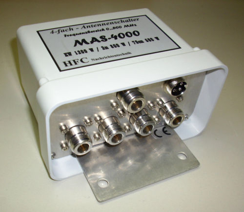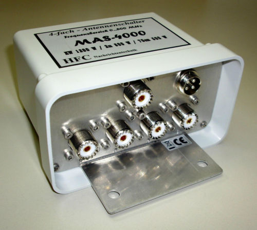 Der MAS-4000 der Fa. HFC Nachrichtentechnik (Frequenzbereich 0 ... 500 MHz) ist ein verlustarmer Antennenumschalter, im wetterfesten Mastgehäuse, mit dem 4 Antennen auf eine gemeinsame Ableitung geschaltet werden können. So kann beispielsweise bei Verwendung eines Koaxkabels die Umschaltung von einer 2-m Antenne auf eine 70-cm Antenne sowie einer KW-Antenne und einer 6-m-Antenne mit dem MAS-4000 vorgenommen werden. Die in SMD-Technik aufgebaute Schaltung sowie leistungsstarke HF-Relais gewährleisten einen breiten Einsatzbereich von der Kurzwelle bis zum 70-cm Band. Aufgrund der niedrigen Dämpfung sind Durchgangsverluste kaum messbar. Die Speisespannung darf zwischen 12 - 15 Volt betragen. Die Leistungsaufnahme beträgt ca. 50 mA. Die nötige Spannungsversorgung wird extern über ein Kabel mittels vierpoliger Buchse vorgenommen. Die Umschaltung zwischen den angeschlossenen Antennen erfolgt über die zugeführte Spannung, d.h. das Ein- bzw. Ausschalten der Spannung bewirkt eine Relaisumschaltung. Bei Nichtanliegen von Spannung ist die Antenne 1 durchgeschaltet. Das Mastgehäuse (135 x 75 x 115 mm) aus deutscher Markenfertigung ist wetter- und UV-beständig. Für die stabile Befestigung des Vorverstärkers am Mast, dient die mitgelieferte Mastschelle. Der Antennenschalter stammt aus deutscher Fertigung. Er ist mit dämpfungsarmen, qualitativ hochwertigen 50 Ohm Teflon-Buchsen ausgestattet. |