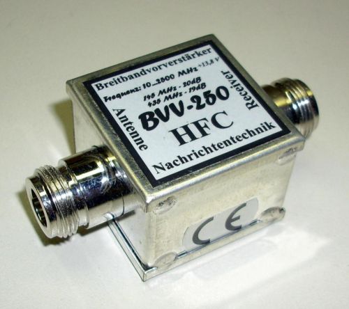 Angeboten wird der Breitbandvorverstärker BVV-250 der Fa. HFC Nachrichtentechnik mit einer charakteristischen Bandbreite von 10 ... 2500 MHz, der mittels Mini-Circuit (MMIC) komplett in SMD-Technik aufgebaut ist. Die Leistungsaufnahme beträgt ca. 20 mA. Die Stromversorgung (+) wird über den Durchführungskondensator (mittels kleiner Öse) und (-)über die längere Lasche (Masse) vorgenommen. Zusätzlich verfügt das Gerät über einen Verpolungsschutz. In der Praxis reicht ein herkömmliches Steckernetzteil zum Betrieb aus. Für beste Ergebnisse sollte der BVV direkt hinter der Antenne betrieben werden. Die nötige Spannungsversorgung kann mittels einer Fernspeiseweiche (siehe andere Auktion) vorgenommen werden. Der Breitbandvorverstärker ist in einem stabilen Weißblech-Gehäuse untergebracht (37 mm x 37 mm x 30 mm). Er stammt aus deutscher Fertigung (Handarbeit). Da der Vorverstärker über einen N-Norm Stecker und eine N-Norm Buchse verfügt, kann er direkt (ohne zusätzliches Koaxkabel) an einen Receiver angeschlossen werden. | |||||||||||||||||||||||||||||||||||||||||||||||||||||||||||||||||||||||||||||||||||||||||||||||||||||