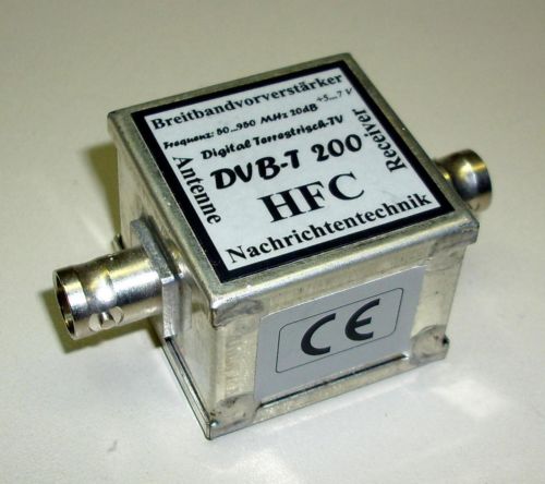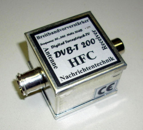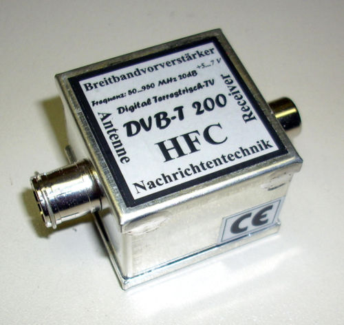 Angeboten wird der Breitbandvorverstärker DVB-T 200 (Breitbandvorverstärker 50 ... 950 MHz) der Fa. HFC Nachrichtentechnik für das Digital Terrestrische-TV, der mittels Mini-Circuit (MMIC) komplett in SMD-Technik aufgebaut ist. Wenn das Bild öfter stehen bleibt oder nur noch Karos und Pixel auf dem Fernseh-Bildschirm zu sehen sind, dann ist der Signalpegel zu gering. Hier hilft unser, speziell für das Digitale Terrestrische Fernsehen entwickelte Vorverstärker DVB-T 200, mit seiner charakteristischen Verstärkung von 20 dB. Die Speisespannung (5/7 Volt) wird direkt über den DVB-T Receiver vorgenommen. Die Leistungsaufnahme beträgt ca. 20/35 mA. Der Vorverstärker ist in einem stabilen Weißblech-Gehäuse untergebracht (37 mm x 37 mm x 30 mm). Er stammt aus deutscher Fertigung (Handarbeit) und ist mit dämpfungsarmen, qualitativ hochwertigen 50 Ohm Teflon-Buchsen ausgestattet. | |||||||||||||||||||||||||||||||||||||||||||||||||||||||||||||||||||||||||||||||||||||||||||||||||||||