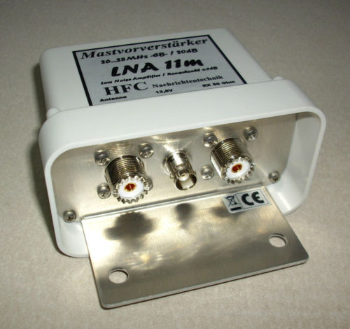 Der rauscharme Mastvorverstärker LNA-11m-Mast (Frequenzbereich 26 MHz ... 28 MHz) der Fa. HFC Nachrichtentechnik besticht, neben einer qualitativ hochwertigen Verarbeitung, mit exellenten technischen Daten. Er dient zur Verbesserung der Empfangseigenschaften von CB Funkstationen im 11-m-Band. Der Vorverstärker ist mit einem Bandfilter ausgestattet, der Außerbandsignale wirkungsvill unterdrückt. In der Eingangsstufe ist ein GaAs-FET gekoppelt, der eine sehr niedrige Rauschzahl und eine hohe Durchgangsverstärkung besitzt. Der Vorverstärker bietet die Möglichkeit der direkten Speisung über eine BNC-Buchse oder der Fernspeisung über das vorhandene Koaxialkabel. Das Gerät verfügt über eine Verpolungsschutzschaltung. Das Mastgehäuse (110 x 60 x 85 mm) aus deutscher Markenfertigung ist wetter- und UV-beständig. Für die stabile Bestigung des Vorverstärkers am Mast, dient die mitgelieferte Mastschelle. | |||||||||||||||||||||||||||||||||||||||||||||||||||||||||||||||||||||||||||||||||||||||||||||||||||||