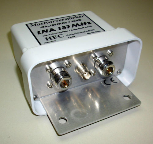 Vorverstärker der Fa. HFC Nachrichtentechnik für den Empfang von umlaufenden Wettersatelliten, Frequenzbereich:136 ... 138 MHz Der Vorverstärker LNA-137 MHz-Mast verbessert den Empfang von polar umlaufenden Wettersatelliten im 137 MHz Bereich. Durch den Einsatz eines GaAs-Fets in der Eingangsstufe wird ein sehr niedriges Rauschmaß bei einer praxisgerechten Verstärkung von ca. 20 dB erreicht. Ein Bandpass-Filter am Eingang des Verstärkers verhindert zuverlässig Störungen durch starke Sender, die sich außerhalb des Arbeitsbereiches befinden. Die Speisespannung darf zwischen 12 - 15 Volt betragen. Die Leistungsaufnahme beträgt ca. 30 mA. Die nötige Spannungsversorgung kann sowohl direkt über ein Kabel als auch mittels einer Fernspeiseweiche (siehe andere Auktion) vorgenommen werden. Das Gerät verfügt über eine Verpolungsschutzschaltung. Es besitzt keine Sende-/Empfangsumschaltung. Das Mastgehäuse (110 x 60 x 85 mm) aus deutscher Markenfertigung ist wetter- und UV-beständig. Für die stabile Bestigung des Vorverstärkers am Mast, dient die mitgelieferte Mastschelle. | |||||||||||||||||||||||||||||||||||||||||||||||||||||||||||||||||||||||||||||||||||||||||||||||||||||