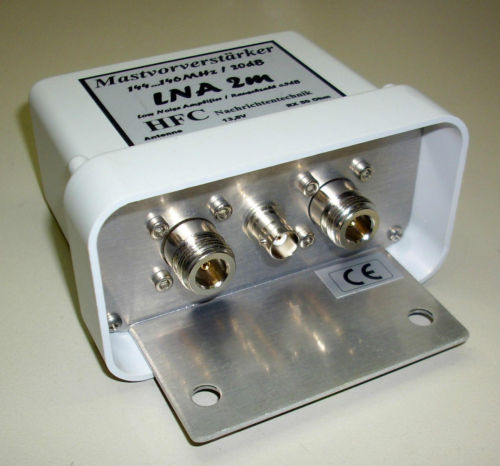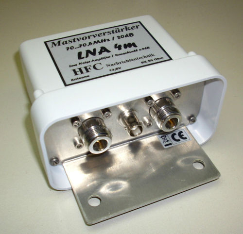 Der rauscharme Mastvorverstärker LNA-4m-Mast (Frequenzbereich 70 MHz ... 70,5 MHz) der Fa. HFC Nachrichtentechnik besticht, neben einer qualitativ hochwertigen Verarbeitung, mit exellenten technischen Daten. Er dient zur Verbesserung der Empfangseigenschaften von Amateurfunkstationen im 4-m-Band. Der Vorverstärker ist mit einem Bandfilter ausgestattet, der Außerbandsignale wirkungsvill unterdrückt. In der Eingangsstufe ist ein GaAs-FET gekoppelt, der eine sehr niedrige Rauschzahl und eine hohe Durchgangsverstärkung besitzt. Der Vorverstärker bietet die Möglichkeit der direkten Speisung über eine BNC-Buchse oder der Fernspeisung über das vorhandene Koaxialkabel. Das Gerät verfügt über eine Verpolungsschutzschaltung. Das Mastgehäuse (110 x 60 x 85 mm) aus deutscher Markenfertigung ist wetter- und UV-beständig. Für die stabile Bestigung des Vorverstärkers am Mast, dient die mitgelieferte Mastschelle. | |||||||||||||||||||||||||||||||||||||||||||||||||||||||||||||||||||||||||||||||||||||||||||||||||||||