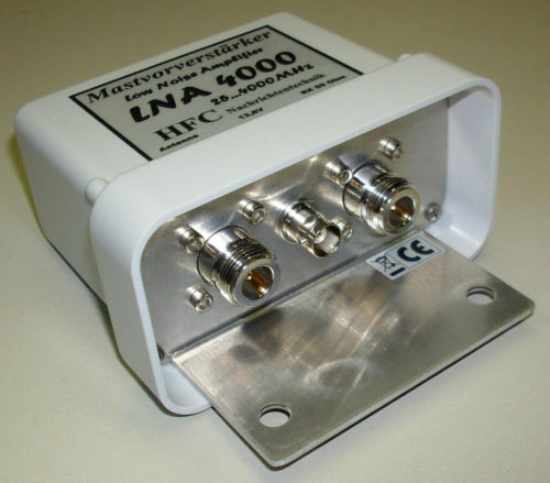 Der moderne Verstärkerchip und das verlustarme Keramik-Mikrowellensubstrat bieten eine hohe Verstärkung über eine Bandbreite von 4 GHz (und darüber hinaus). Weiterhin wird durch den Einsatz von hochwertigen Mikrostrip N-Buchsen eine niedrige Rauschzahl erreicht. Durch sein geringes Rauschmaß, die äußerst lineare Verstärkungskurve und das gute Großsignalverhalten klassifiziert sich der LNA-4000 für viele Anwendungen: - als Multiband-Vorverstärker für Scanner und Empfänger für die Amateurbänder 10m 13cm - zum Empfang von Wetter- und Nachrichtensatelliten im L-Band - zum DX-Empfang von Radio- und Fernsehsendern - zur Erhöhung der Messempfindlichkeit von Messsystemen Die Speisespannung darf 12 - 15 Volt betragen. Die Leistungsaufnahme beträgt ca. 85 mA. Die nötige Spannungsversorgung kann sowohl direkt über ein Kabel mit BNC-Anschluss (Plus an Innenleiter, Minus an Masse) als auch mittels einer Fernspeiseweiche (siehe FSW-1000 aus unserem Lieferprogramm) vorgenommen werden. Das Gerät verfügt über eine Verpolungsschutzschaltung. Für beste Ergebnisse sollte der LNA-4000 direkt hinter einer angepassten Antenne betrieben werden. Das Mastgehäuse (110 x 60 x 85 mm) aus deutscher Markenfertigung ist wetter- und UV-beständig. | |||||||||||||||||||||||||||||||||||||||||||||||||||||||||||||||||||||||||||||||||||||||||||||||||||||