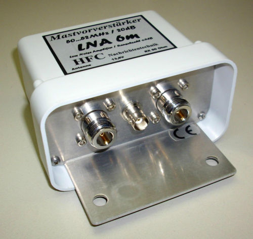 Der rauscharme Mastvorverstärker LNA-6m-Mast (Frequenzbereich 50 MHz ... 52 MHz) der Fa. HFC Nachrichtentechnik besticht, neben einer qualitativ hochwertigen Verarbeitung, mit exellenten technischen Daten. Er dient zur Verbesserung der Empfangseigenschaften von Amateurfunkstationen im 6-m-Band. Der Vorverstärker ist mit einem Bandfilter ausgestattet, der Außerbandsignale wirkungsvill unterdrückt. In der Eingangsstufe ist ein GaAs-FET gekoppelt, der eine sehr niedrige Rauschzahl und eine hohe Durchgangsverstärkung besitzt. Der Vorverstärker bietet die Möglichkeit der direkten Speisung über eine BNC-Buchse oder der Fernspeisung über das vorhandene Koaxialkabel. Das Gerät verfügt über eine Verpolungsschutzschaltung. Das Mastgehäuse (110 x 60 x 85 mm) aus deutscher Markenfertigung ist wetter- und UV-beständig. Für die stabile Bestigung des Vorverstärkers am Mast, dient die mitgelieferte Mastschelle. | |||||||||||||||||||||||||||||||||||||||||||||||||||||||||||||||||||||||||||||||||||||||||||||||||||||