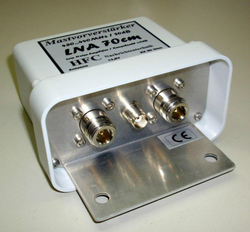 Der rauscharme Vorverstärker LNA - 70cm - Mast (Frequenzbereich 430 ... 440 MHz) der Fa. HFC Nachrichtentechnik besticht neben einer qualitativ hochwertigen Verarbeitung mit exzellenten technischen Daten. Er dient zur Verbesserung der Empfangseigenschaften von Amateurfunkstationen im 70-cm-Band. Der Vorverstärker ist mit einem Bandpassfilter ausgestattet, der Außerbandsignale wirkungsvoll unterdrückt. In der Eingangsstufe ist ein GaAs-FET gekoppelt, der eine sehr niedrige Rauschzahl und eine hohe Durchgangsverstärkung besitzt. Der Vorverstärker bietet die Möglichkeit der direkten Speisung über eine BNC-Buchse oder der Fernspeisung über das vorhandene Koaxialkabel. Das Gerät verfügt über eine Verpolungsschutzschaltung. Das Mastgehäuse aus deutscher Markenfertigung ist wetter- und UV-beständig. Für die stabile Befestigung des Vorverstärkers am Mast, dient die mitgelieferte Mastschelle. | |||||||||||||||||||||||||||||||||||||||||||||||||||||||||||||||||||||||||||||||||||||||||||||||||||||