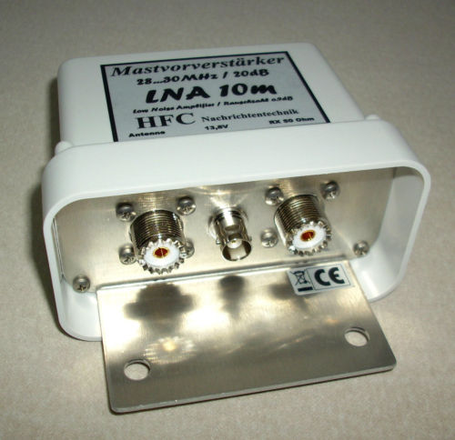 Der rauscharme Mastvorverstärker LNA-10m-Mast (Frequenzbereich 28 MHz ... 30 MHz) der Fa. HFC Nachrichtentechnik besticht, neben einer qualitativ hochwertigen Verarbeitung, mit exellenten technischen Daten. Er dient zur Verbesserung der Empfangseigenschaften von Amateurfunkstationen im 10-m-Band. Der Vorverstärker ist mit einem Bandfilter ausgestattet, der Außerbandsignale wirkungsvill unterdrückt. In der Eingangsstufe ist ein GaAs-FET gekoppelt, der eine sehr niedrige Rauschzahl und eine hohe Durchgangsverstärkung besitzt. Der Vorverstärker bietet die Möglichkeit der direkten Speisung über eine BNC-Buchse oder der Fernspeisung über das vorhandene Koaxialkabel. Das Gerät verfügt über eine Verpolungsschutzschaltung. Das Mastgehäuse (110 x 60 x 85 mm) aus deutscher Markenfertigung ist wetter- und UV-beständig. Für die stabile Bestigung des Vorverstärkers am Mast, dient die mitgelieferte Mastschelle. | |||||||||||||||||||||||||||||||||||||||||||||||||||||||||||||||||||||||||||||||||||||||||||||||||||||
