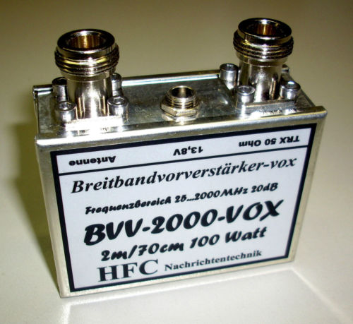 Der rauscharme Breitband-Vorverstärker BVV-2000-VOX -LED(Frequenzbereich 25 MHz bis 2 GHz) der Fa. HFC Nachrichtentechnikdient zur Verbesserung der Empfangseigenschaften von Amateurfunkstationen im 2-m und im 70-cm Band. Er ist aber aufgrund seines breiten Frequenzspektrums von 25 ... 2000 MHz auch universell für andere Bänder RX-seitig einsetzbar. Die automatische Sende-Empfangsumschaltung schaltet den Verstärker beim Senden ab und beim Empfang wieder zu. Die maximal übertragbare Leistung beträgt dabei 100 Watt! Der VORVERSTÄRKER ist in moderner SMD-Technik auf kleinstem Raum aufgebaut. Die Gesamtverstärkung wird mit einem speziellen Kleinleistungs-MMIC auf mindestens 20 dB angehoben. Der Vorverstärker bietet die Möglichkeit der direkten Speisung über eine Cinch-Buchse oder der Fernspeisung über das vorhandene Koaxialkabel. Das Gerät verfügt über eine Verpolungsschutzschaltung. Der Vorverstärker ist in einem stabilen Weißblechgehäuse (74 x 56 x 30 mm) untergebracht. | ||||||||||||||||||||||||||||||||||||||||||||||||||||||||||||||||||||||||||||||||||||||||||||||||||||