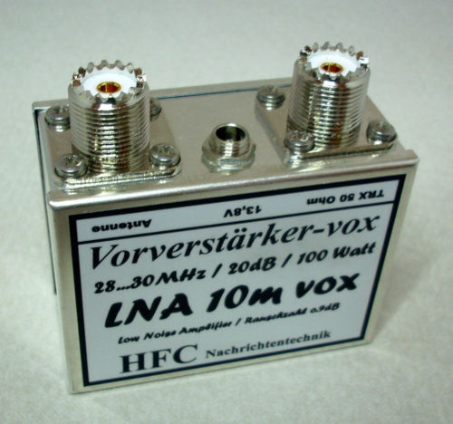 Der rauscharme Vorverstärker LNA - 10m - VOX (Low Noise Amplifier) - Frequenzbereich 28 ... 30 MHz - der Fa. HFC Nachrichtentechnik besticht neben einer qualitativ hochwertigen Verarbeitung mit exzellenten technischen Daten. Er dient zur Verbesserung der Empfangseigenschaften von Amateurfunkstationen im 10-m-Band. Der Vorverstärker ist mit einem Bandpassfilter ausgestattet, der Außerbandsignale wirkungsvoll unterdrückt. In der Eingangsstufe ist ein GaAs-FET gekoppelt, der eine sehr niedrige Rauschzahl und eine hohe Durchgangsverstärkung besitzt. Der Vorverstärker bietet die Möglichkeit der direkten Speisung über eine Cinch-Buchse oder der Fernspeisung (mittels Fernspeiseweiche, siehe andere Auktion) über das vorhandene Koaxialkabel. Der LNA-10m-VOX verfügt über eine automatische Sende-/Empfangsumschaltung. Maximal übertragbare Leistung: 100 Watt !!! Der Vorverstärker LNA-10m-VOX ist in einem stabilen Weißblech-Gehäuse (74 x 56 x 30 mm) untergebracht. | ||||||||||||||||||||||||||||||||||||||||||||||||||||||||||||||||||||||||||||||||||||||||||||||||||||