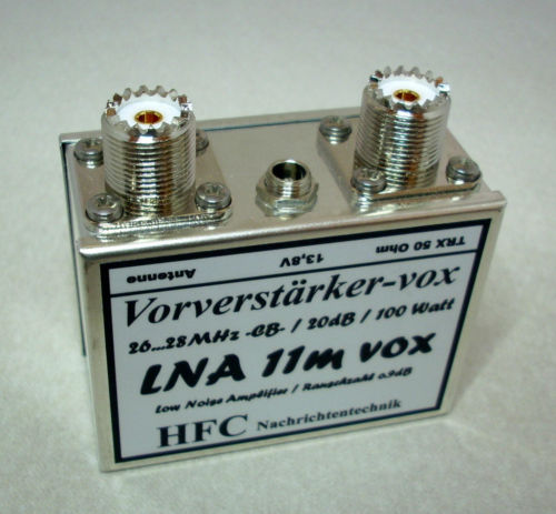 Der rauscharme Vorverstärker LNA - 11m - VOX (Low Noise Amplifier) - Frequenzbereich 26 ... 28 MHz - der Fa. HFC Nachrichtentechnik besticht neben einer qualitativ hochwertigen Verarbeitung mit exzellenten technischen Daten. Er dient zur Verbesserung der Empfangseigenschaften von CB Funkstationen im 11-m-Band. Der Vorverstärker ist mit einem Bandpassfilter ausgestattet, der Außerbandsignale wirkungsvoll unterdrückt. In der Eingangsstufe ist ein GaAs-FET gekoppelt, der eine sehr niedrige Rauschzahl und eine hohe Durchgangsverstärkung besitzt. Der Vorverstärker bietet die Möglichkeit der direkten Speisung über eine Cinch-Buchse oder der Fernspeisung (mittels Fernspeiseweiche, siehe andere Auktion) über das vorhandene Koaxialkabel. Der LNA-11m-VOX verfügt über eine automatische Sende-/Empfangsumschaltung. Maximal übertragbare Leistung: 100 Watt !!! Der Vorverstärker LNA-11m-VOX ist in einem stabilen Weißblech-Gehäuse (74 x 56 x 30 mm) untergebracht. | ||||||||||||||||||||||||||||||||||||||||||||||||||||||||||||||||||||||||||||||||||||||||||||||||||||
