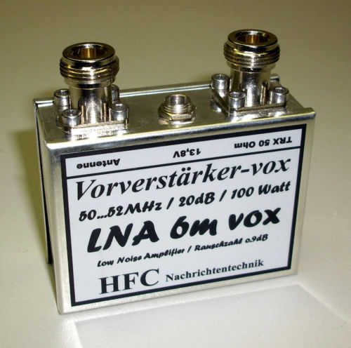 Der rauscharme Vorverstärker LNA - 6m - VOX (Low Noise Amplifier) - Frequenzbereich 50 ... 52 MHz - der Fa. HFC Nachrichtentechnik besticht neben einer qualitativ hochwertigen Verarbeitung mit exzellenten technischen Daten. Er dient zur Verbesserung der Empfangseigenschaften von Amateurfunkstationen im 6-m-Band. Der Vorverstärker ist mit einem Bandpassfilter ausgestattet, der Außerbandsignale wirkungsvoll unterdrückt. In der Eingangsstufe ist ein GaAs-FET gekoppelt, der eine sehr niedrige Rauschzahl und eine hohe Durchgangsverstärkung besitzt. Der Vorverstärker bietet die Möglichkeit der direkten Speisung über eine Cinch-Buchse oder der Fernspeisung (mittels Fernspeiseweiche, siehe andere Auktion) über das vorhandene Koaxialkabel. Der LNA-6m-VOX verfügt über eine automatische Sende-/Empfangsumschaltung. Maximal übertragbare Leistung: 100 Watt !!! Der Vorverstärker LNA-6m-VOX ist in einem stabilen Weißblech-Gehäuse (74 x 56 x 30 mm) untergebracht. | ||||||||||||||||||||||||||||||||||||||||||||||||||||||||||||||||||||||||||||||||||||||||||||||||||||