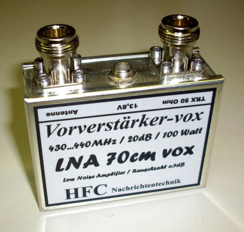 Der rauscharme Vorverstärker LNA - 70cm - VOX (Low Noise Amplifier) - Frequenzbereich 430 ... 440 MHz - der Fa. HFC Nachrichtentechnik besticht neben einer qualitativ hochwertigen Verarbeitung mit exzellenten technischen Daten. Er dient zur Verbesserung der Empfangseigenschaften von Amateurfunkstationen im 70-cm-Band. Der Vorverstärker ist mit einem Bandpassfilter ausgestattet, der Außerbandsignale wirkungsvoll unterdrückt. In der Eingangsstufe ist ein GaAs-FET gekoppelt, der eine sehr niedrige Rauschzahl und eine hohe Durchgangsverstärkung besitzt. Der Vorverstärker bietet die Möglichkeit der direkten Speisung über eine Cinch-Buchse oder der Fernspeisung (mittels Fernspeiseweiche, siehe andere Auktion) über das vorhandene Koaxialkabel. Der LNA-70cm-VOX verfügt über eine automatische Sende-/Empfangsumschaltung. Maximal übertragbare Leistung: 100 Watt !!! Der Vorverstärker LNA-70cm-VOX ist in einem stabilen Weißblech-Gehäuse (74 x 56 x 30 mm) untergebracht. | ||||||||||||||||||||||||||||||||||||||||||||||||||||||||||||||||||||||||||||||||||||||||||||||||||||