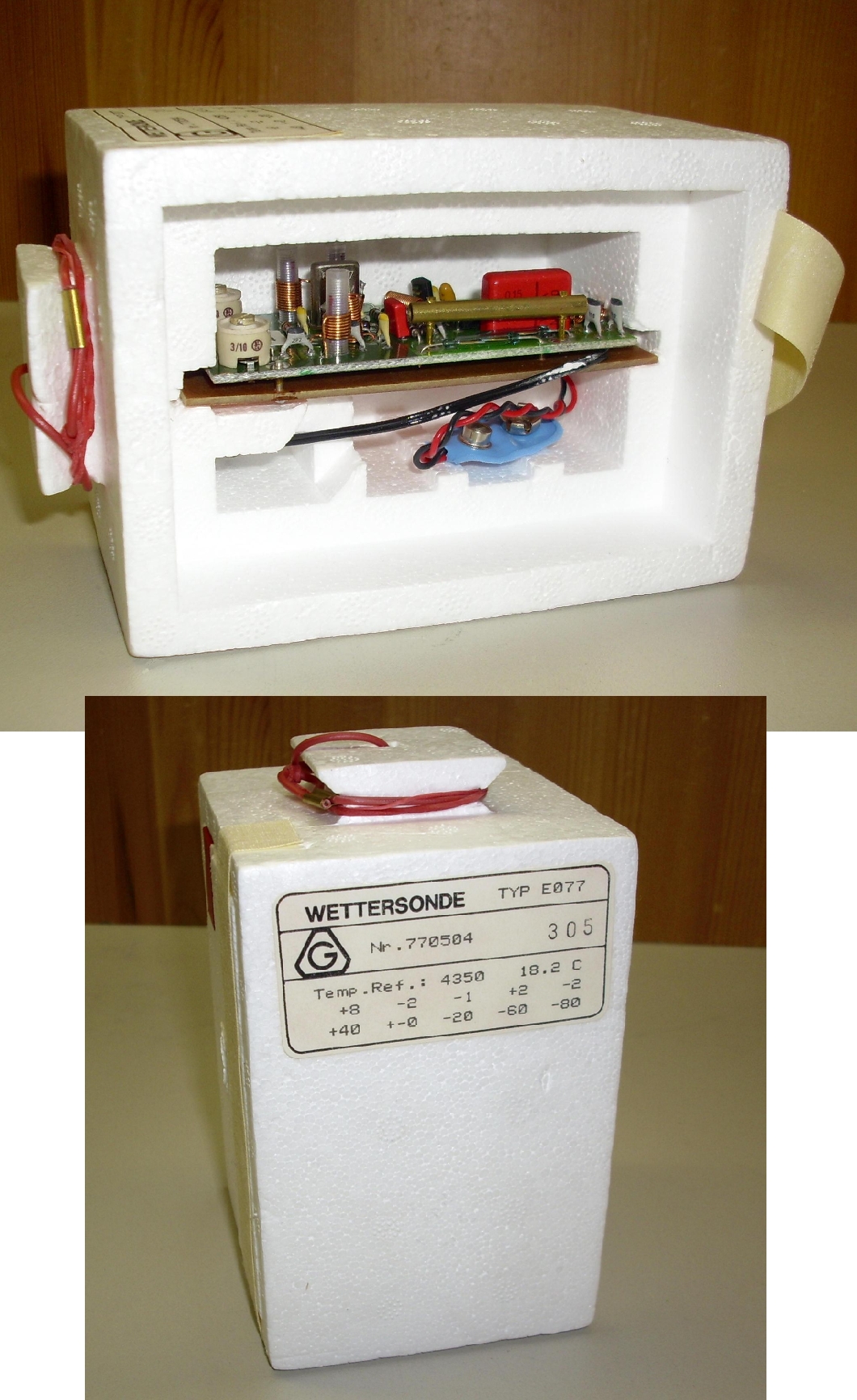 Die Wettersonde der Fa. Sprenger KG vom Typ E084 wurde als Nutzlast an einem Wetterballon verwendet. Sie ist mit MD-Bauteilen bestückt. Diese Sonden eignen sich aber auch z.B. für Amateurfunkzwecke und allgemeine Bastelprojekte. Das Besondere daran ist, daß die Sendeplatine und die Meßwerterfassung / Signalerzeugung auf getrennten Platinen aufgebaut, und mit wenigen Lötstützen huckepack verbunden ist. So lässt sich der Tongenerator sehr einfach demontieren und durch eigene Schaltungen (Modem, Mikrofonvorverstärker...) ersetzen. Der Sender ist mit einer Stahlblattantenne bestückt, die Sendefrequenz wird mittels einer PLL-Regelschleife und einem Referenzquarz stabilisiert. Der Vorteiler besitzt vier mögliche Teilungsfaktoren, welche mittels Lötbrücken eingestellt werden können. Im Originalzustand senden die Sonden auf 403,05MHz ein Signal mit 70mW aus, sobald eine 9V-Batterie angeschlossen wird. Zum Lieferumfang gehört eine ausführliche Dokumentation (15 DIN-A4-Seiten). | ||||||||||||||||||||||||||||||||||||||||||||||||||||||||||||||||||||||||||||||||||||||||||||||||