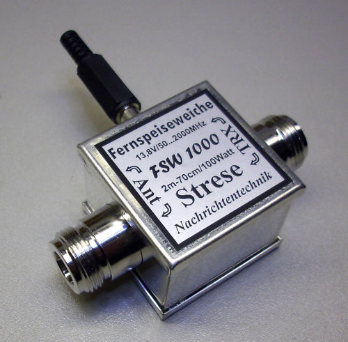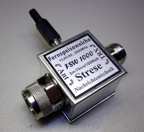 Die Fernspeiseweiche FSW 1000 (50 MHz ... 2000 MHz) der Fa. Strese Nachrichtentechnik dient der Spannungsversorgung von Mast-Vorverstärkern bzw. Konvertern über das vorhandene Koaxkabel. Die HF-gerechte Konstruktion garantiert eine äußerst niedrige Dämpfung mit sehr guter Anpassung über ein Frequenzspektrum von 50 bis 2000 MHz. Die Speisespannung beträgt 13,8 Volt und wird mittels einer DC-Buchse (Minus an Masse) der Weiche zugeführt. Der Anschluss "TRX" wird über ein Koaxkabel mit dem Transceiver, bzw. Empfänger verbunden. Der Anschluss "Antenne" wird über ein Koaxkabel (oder direkt) mit dem zu versorgenden Gerät (Vorverstärker, Aktivantenne, Konverter) verbunden. Das Gerät verfügt über eine Verpolungsschutzschaltung. Die Fernspeiseweiche ist in einem stabilen Weißblech-Gehäuse untergebracht. Technische Daten: Frequenzbereich: 50 ... 2000 MHz Einfügedämpfung (145MHz ): 0,1 dB Speisespannung: 13,8 V Buchse-Stecker: N-Norm Übertragbare Leistung (max.): 100 Watt Abmessungen: 37 x 37 x 30 mm | ||||||||||||||||||||||||||||||||||||||||||||||||||||||||||||||||||||||||||||||||||||||||||||||||||||