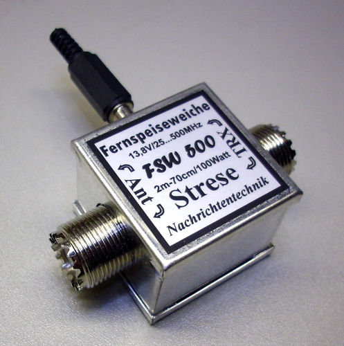 Die Fernspeiseweiche FSW 500 (25 MHz ... 500 MHz) der Fa. Strese Nachrichtentechnik dient der Spannungsversorgung von Mast-Vorverstärkern bzw. Konvertern über das vorhandene Koaxkabel. Die HF-gerechte Konstruktion garantiert eine äußerst niedrige Dämpfung mit sehr guter Anpassung über ein Frequenzspektrum von 25 bis 500 MHz. Die Speisespannung beträgt 13,8 Volt und wird mittels einer DC-Buchse (Minus an Masse) der Weiche zugeführt. Der Anschluss "TRX" wird über ein Koaxkabel mit dem Transceiver, bzw. Empfänger verbunden. Der Anschluss "Antenne" wird über ein Koaxkabel mit dem zu versorgenden Gerät (Vorverstärker, Aktivantenne, Konverter) verbunden. Das Gerät verfügt über eine Verpolungsschutzschaltung. Die Fernspeiseweiche ist in einem stabilen Weißblech-Gehäuse untergebracht. Technische Daten: Frequenzbereich: 25 ... 500 MHz Einfügedämpfung (145MHz ): 0,1 dB Speisespannung: 13,8 V Buchsen: UHF (PL) Übertragbare Leistung (max.): 100 Watt Abmessungen: 37 x 37 x 30 mm | |||||||||||||||||||||||||||||||||||||||||||||||||||||||||||||||||||||||||||||||||||||||||||||||||||||